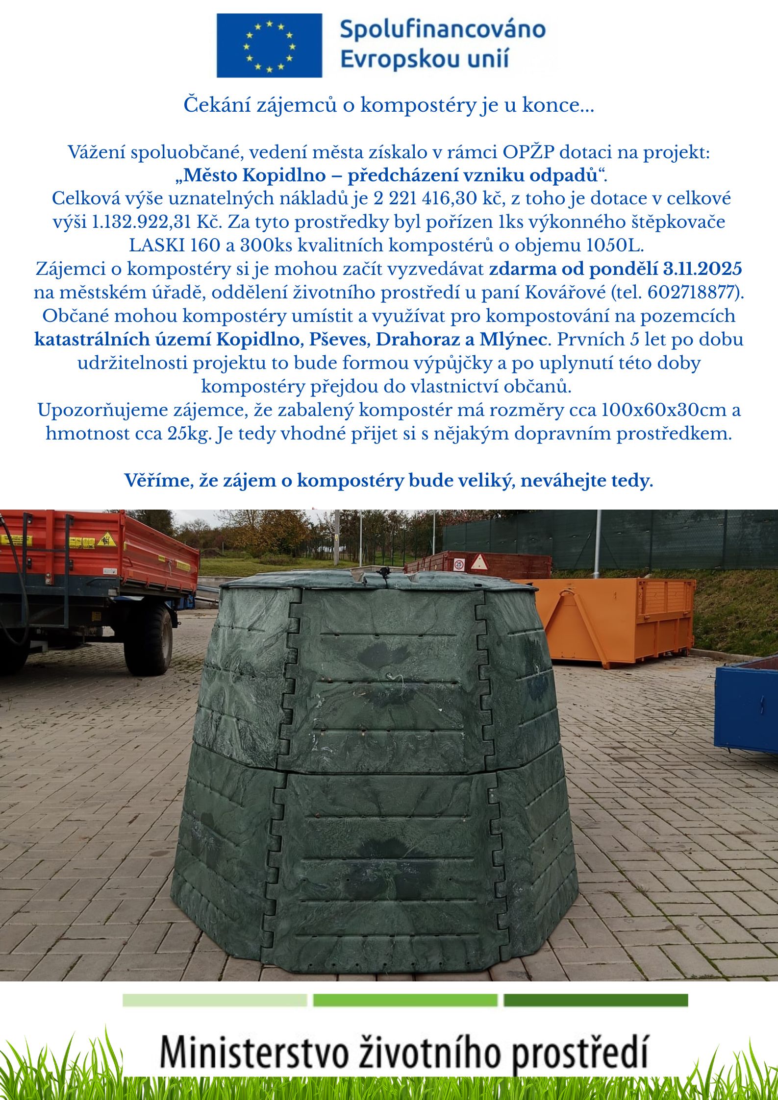 Městský úřad Kopidlno, oddělení ŽP – paní Kovářová (tel. 602 718 877)Kompostéry lze využívat na pozemcích v k. ú. Kopidlno, Pševes, Drahoraz a Mlýnec.
